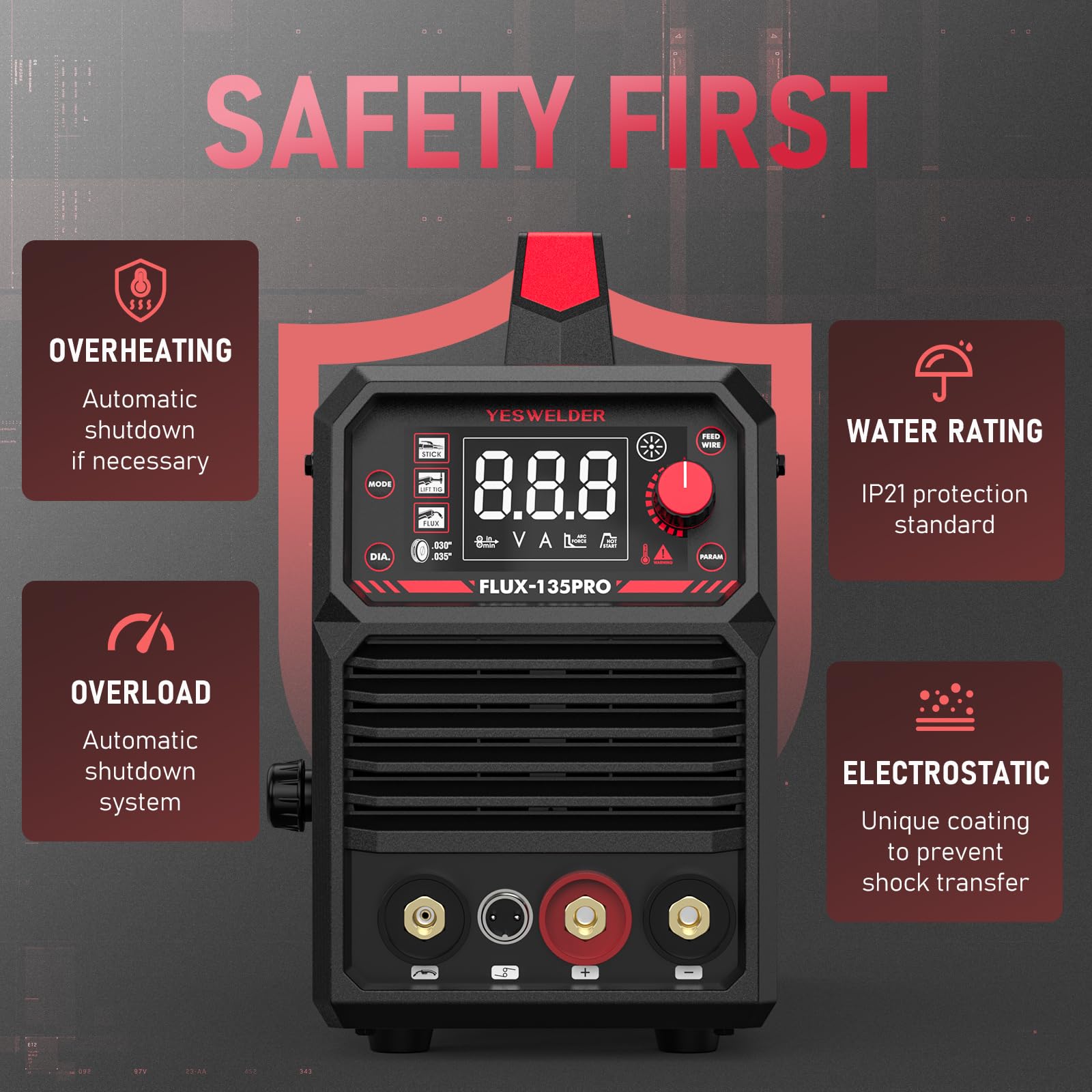 YESWELDER 135Amp MIG Welder,110V Flux Core Welder Flux Core MIG/Lift TIG/Stick 3-in-1 Large LED Digital Display Welding Machine IGBT Inverter Welder FLUX-135PRO